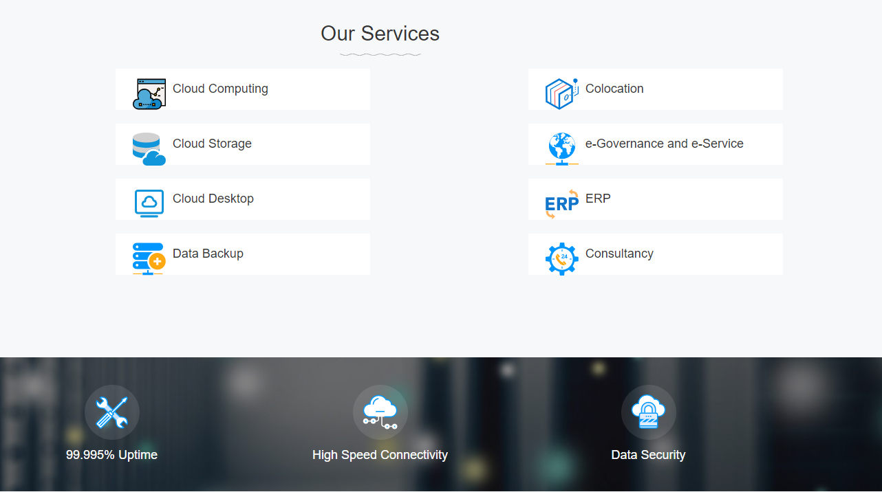এই ডাটা সেন্টার থেকে ক্লাউড কম্পিউটিং, ক্লাউড ডেস্কটপ, ক্লাউড স্টোরেজ, ডাটা স্টোরেজ ও ব্যাকআপ, ডাটা সিকিউরিটি এবং কো-লোকেশনসহ নানা অত্যাধুনিক সেবা প্রদান করা হয়। ৯৯.৯৯৫% আপটাইমের নিশ্চয়তা এবং ২৪x৭ সেবা নিশ্চিত করতে এটি দক্ষ ও প্রশিক্ষিত জনবল দ্বারা পরিচালিত হচ্ছে।